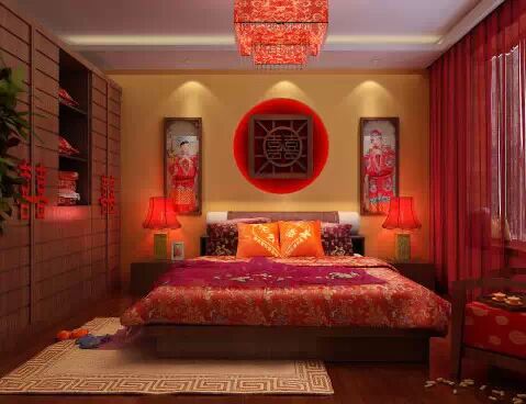 红色布置有效地突出喜庆的气氛。漂亮大气的窗帘,喜气的墙壁,还有恰到好处的床头灯,恩,我看行!