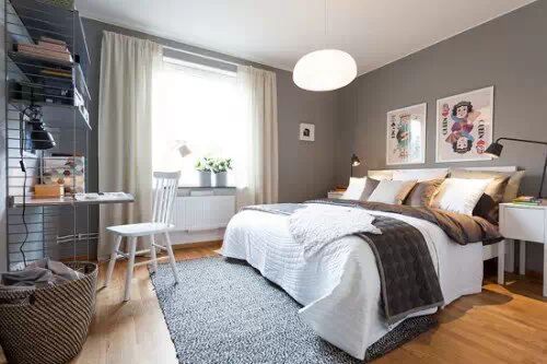 简欧风格。主卧采用灰色的涂料粉刷背景墙,增强了空间的连贯性和和谐质感,干净利落的空间布局让卧室诠释着简欧风格的简单、舒适。